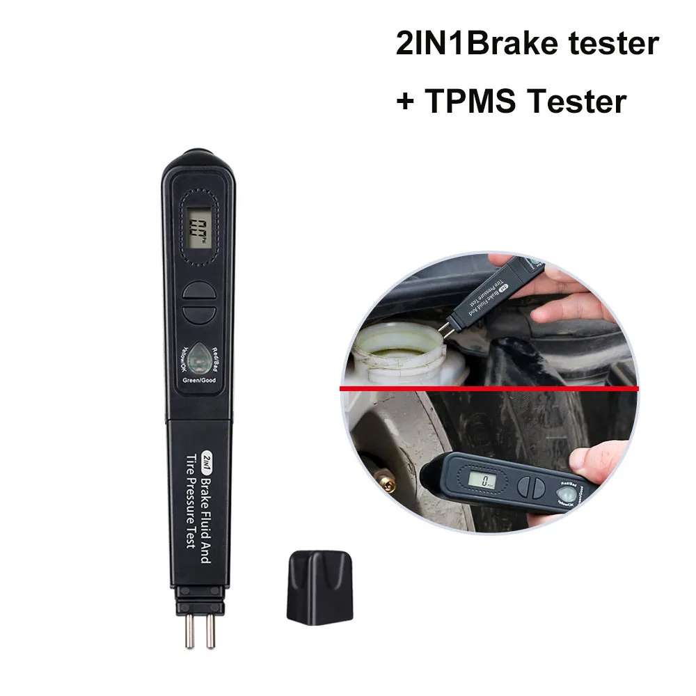 Name: Probador de líquido de frenos, pluma con 5 LED, probador de presión de neumáticos, herramienta de diagnóstico 2 en 1, comprobador de frenos de coche, herramienta para vehículo